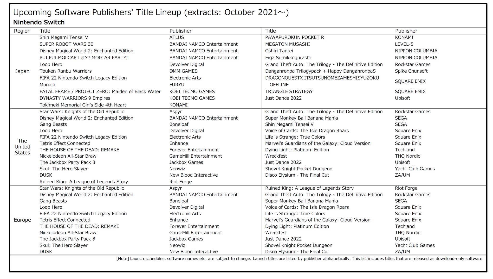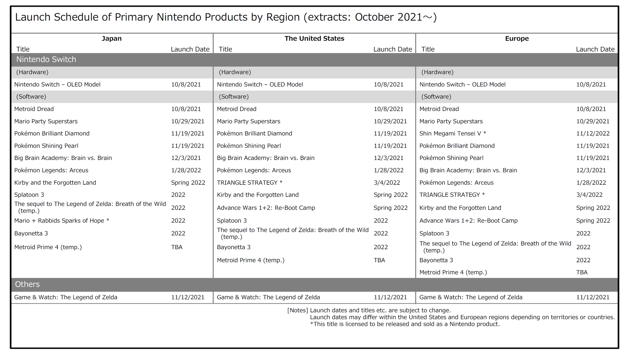 préférences et leur style de vie. Nous avons pour objectif de transmettre l’attrait du trio matériel composé de la Nintendo Switch, de la Nintendo Switch Lite et de la Nintendo Switch – OLED Model afin de développer davantage les ventes. En ce qui concerne les logiciels, Metroid Dread et Mario Party Superstars sont tous deux sortis en octobre, et les sorties à venir comprennent Pokémon Brilliant Diamond et Pokémon Shining Pearl (novembre), Big Brain Academy : Brain vs. Brain (décembre) et Pokémon Legends : Arceus (janvier). Il existe également une grande variété de titres attrayants d’autres éditeurs de logiciels dont la sortie est prévue. Et en plus des nouveaux titres, nous nous efforcerons de renforcer les ventes des titres populaires déjà sortis. Nous travaillons également à dynamiser la plateforme en améliorant notre service Nintendo Switch Online. Un nouveau plan d’abonnement appelé Nintendo Switch Online + Expansion Pack offre aux membres l’accès non seulement aux services de base mais aussi aux titres Nintendo 64 et autres, ainsi qu’au contenu additionnel payant pour Animal Crossing : New Horizons.
