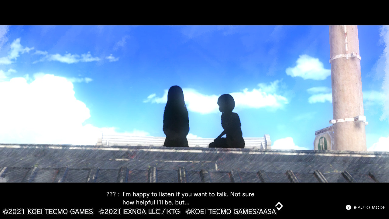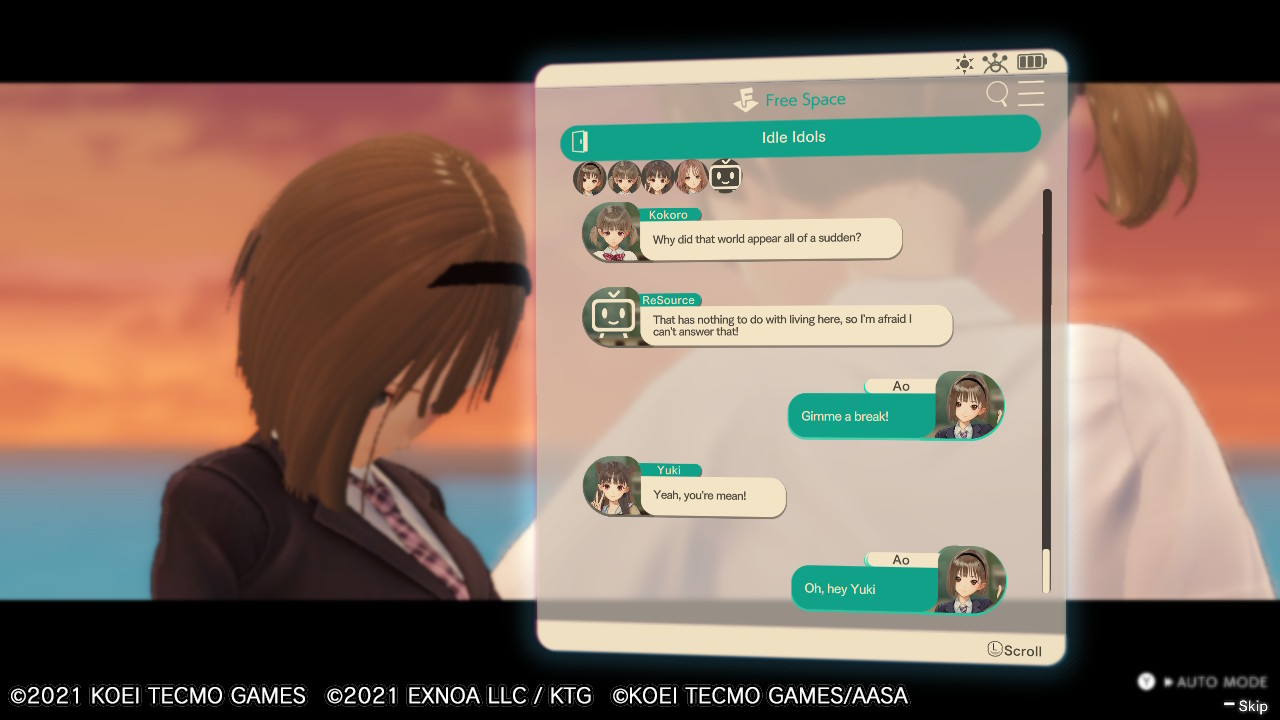 Malgré cette unité forte qui semble désormais unir nos chères lycéennes, le scénario ne fait que s’emplir de questions à mesure que nous progressons. Quel est cet endroit ? Pourquoi tout le monde hormis Ao a perdu tous ses souvenirs ? Comment Ao a-t-elle pu se retrouver dans ce monde ? Pourra-t-elle repartir dans le sien ? Pourquoi Yuki ne peut-elle pas se servir de ses pouvoirs en dépit de sa bague ? Qui est ReSource ? Qu’allons-nous faire pour le repas de ce soir ? Et surtout… Y a-t-il vraiment un fantôme qui erre sur le toit ?