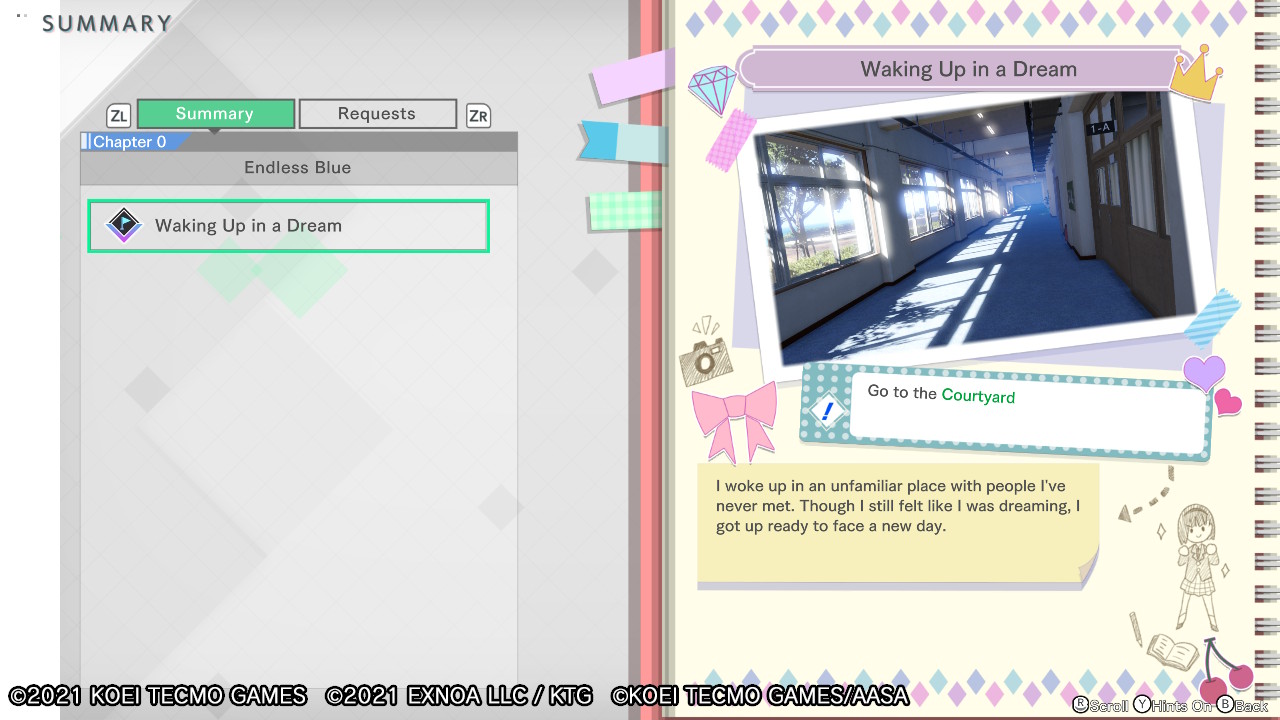 Le jeu nous permet de voir quelques interactions bonus intéressantes, quoique brèves, en haut à gauche de l’écran une fois un nouvel objectif défini. Ce dernier sera affiché directement sur l’écran, dépeint par le symbole d’un drapeau vert sur la carte. Grâce à ce petit détail, il sera difficile pour vous de vous perdre ; un excellent point si, comme nous, vous ne savez pas vous repérer pour un sou – dans la vie comme dans les jeux vidéo. Vous pourrez également apercevoir un petit résumé de l’histoire qui va se mettre à jour au fur et à mesure que vous progresserez dans l’histoire. Un petit résumé coloré, avec des images, sous forme d’un petit journal mignon, où Ao notera également son ressenti par rapport aux événements qu’elle s’apprêtera à vivre. Ce résumé, vous le retrouverez directement dans le menu.