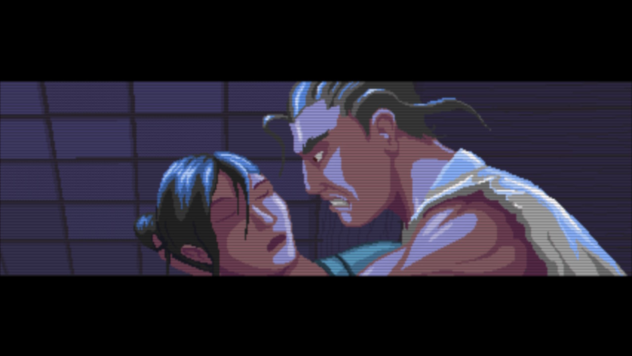 Okinawa Rush nous régale d’un pixel art de toute beauté, en sus d’une bande-son en parfaite harmonie avec le Japon féodal par sa mélancolie, mais aussi avec la nervosité des phases de baston, dans ces moments-là volontiers survoltée. Certains panoramas, exquis, s’assortissent d’animations subtiles qui forcément, nous font voyager, tels ces pétales de fleurs de cerisiers qu’emporte le vent dans son sillage. Les environnements se renouvellent constamment. De magnifiques cinématiques de pixels introduisent quant à elles les trames scénaristiques spécifiques aux trois personnages, dont les destinées respectives s’avèrent d’autant plus plaisantes à suivre que le soft est intégralement traduit en français.