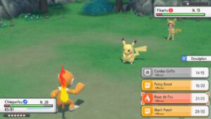 L’une des plus grandes simplifications concerne le gain d’XP. Dès le tout début du jeu, vos Pokémons se partagent l’expérience gagnée en combats, ou plutôt, tous gagnent de l’expérience en combats, pas seulement le Pokémon attaquant. Contrairement aux autres jeux de la licence, ce n’est pas un objet « Multi-Exp », c’est une option par défaut et non négociable, nous ne pouvons pas la changer. C’est à la fois positif et négatif ; c’est positif car le farm est toujours un peu ennuyeux dans Pokémon, même si la possibilité de refaire des combats de dresseurs rajoute du confort dans le farm. Négatif, car du coup le jeu perd énormément en difficulté, votre Pokémon attaquant principalement gagne plus d’expérience. Par exemple, à un moment nous avions notre Chimpenfeu niveau 30 et tout le reste de notre équipe autour du niveau 25, quand les adversaires avaient des Pokémons de niveau 15-18. Nous roulons donc assez facilement sur le jeu, nous n’avons par exemple presque jamais eu besoin de changer notre Pokémon de départ en combat et il n’est jamais mort.