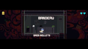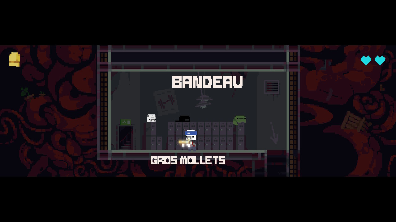 Nous n’avons pas réellement saisis les différences entre les chapeaux, mis à part la santé qui varie en fonction. Nous n’avons compris que trois chapeaux : un rempli tous les étages de grenouilles (si nous le gardons de zone en zone, tous les ennemis seront des grenouilles), un augmente le score de chaque kill, et l’autre augmente la portée de ramassage de la balle. Nous avons, avant de lancer un run, la possibilité de changer le chapeau dans un vestiaire.
