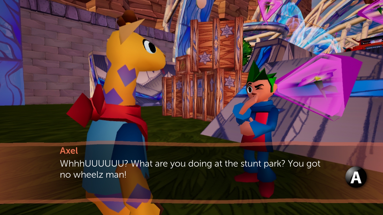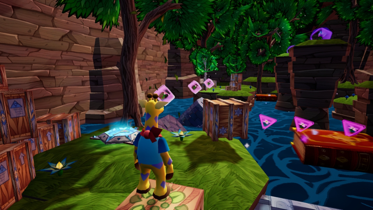 Votre girafe est un acrobate de haut rang, elle est capable de faire un double saut, faire un triple saut à la Mario 64, faire une attaque tourbillon tel un Crash Bandicoot, faire des sauts contre les murs ou encore faire un saut plongé comme dans Mario Odyssey. Vous obtiendrez aussi un jet-pack qui vous permettra de planer sur une certaine distance. On vous laisse beaucoup de liberté de mouvement dans ces niveaux, peut-être même trop. Le jeu n’est vraiment pas dur et vous avez tellement de mouvement possible que mourir sera difficile. Vous pouvez littéralement faire des sauts contre le mur à l’infini ou enchaîner jet-pack & double saut vous pourrez abuser des mécaniques du jeu.