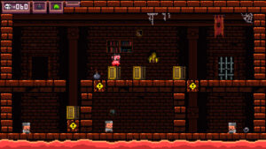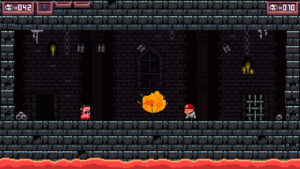 Notre perso bouge nerveusement avec des sauts bien secs et de (très) faible amplitude. Comme le perso s’emballe facilement et que le jeu exige une grande précision, se rater sera chose courante, même sur des actions banales comme par exemple sauter sur un ennemi immobile. Quelque part, c’est voulu et c’est le poil à gratter du jeu. Le HUD arbore un beau compteur de morts, histoire de gentiment se moquer du joueur à mesure que le nombre à trois chiffres s’affole. Si par malheur, vous bloquez sur un niveau, vous risquez même de voir ce compteur exploser. À noter que le bouton X permet de se suicider joyeusement afin de reprendre tout le niveau à 0.