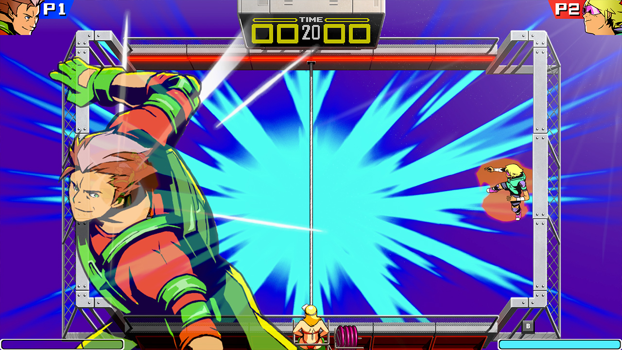 Sauf que le rythme effréné du jeu nous empêche d’avoir un seul instant pour réfléchir. Et si la version de 1994 se jouait avec deux boutons, c’est maintenant avec quatre qu’il faudra composer. Nous devons donc déplacer notre personnage, le faire dasher pour atteindre les zones les plus éloignées rapidement, et c’est là que tout se complique. Si nous arrivons à attraper le frisbee, nous pouvons le relancer en choisissant l’angle de tir, mais il est bien plus intéressant de le frapper juste avant pour l’envoyer en l’air et ainsi pouvoir charger notre personnage et lancer une attaque plus puissante. Autant dire que le timing est primordial.