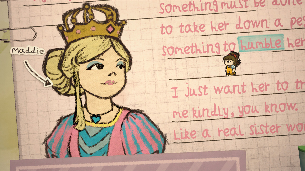 Chaque illustration nous interpellera expliquant ainsi sa raison d’être. Cela peut aller de l’héroïne préférée de Sarah à la représentation de sa sœur en démon. Ces missives ainsi que ces dialogues nous en apprennent un peu plus sur les relations de Sarah avec le monde qui l’entoure. Le point important du gameplay arrive maintenant. Pour réussir à débloquer la situation à laquelle nous faisons face, nous devrons trouver les mots correspondants dans la lettre puis l’envoyer sur l’illustration.
