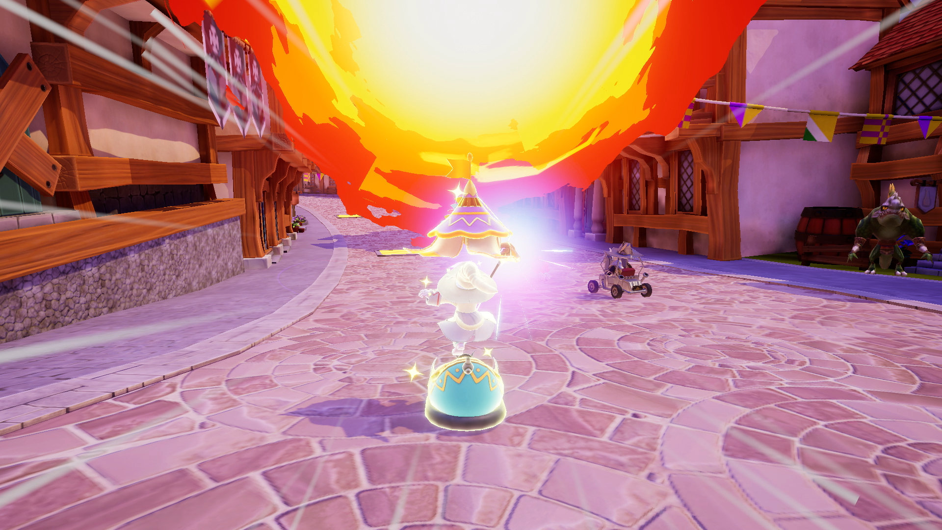 Les objets jonchent le circuit et se distinguent en deux catégories. De drôles d’œufs magiques se brisent sous l’arrivée du joueur et donnent naissance à une magilithe. Une magiquoi… ? Magilithe… qui n’est autre qu’un pouvoir afin de faire le caïd sur la piste. Ces petits bonus peuvent ainsi donner lieu à une accélération plus ou moins conséquente, à un bouclier, mais aussi à quelques attaques féroces contre les autres bolides. L’originalité du titre s’affiche dans la possibilité d’améliorer la puissance des magilithes en choisissant stratégiquement l’œuf récolté, tout en les cumulant. La couleur n’est pas sans importance… à vous de faire vos propres expériences afin de trouver les combinaisons les plus dévastatrices sur la piste !
