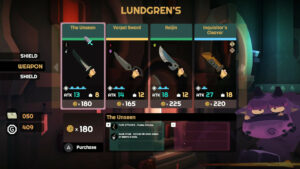 Toutes ces modifications et améliorations ont bien sûr un prix. Young Souls nous permet de consommer deux types de monnaie. Celle en cours chez les gobelins et celle disponible chez les humains. Si la première s’obtient en parcourant les dédales du donjon et permet d’améliorer notre équipement, la seconde nécessite la vente de divers objets. Qu’ils soient débusqués dans le monde du dessus ou récupérés dans celui du dessous, ces objets, une fois vendus, nous octroie des billets à dépenser en cosmétique pour nos deux héros. C’est alors un vaste monde de couvre-chef, de hauts, de bas et de chaussures qui s’offre à nous.