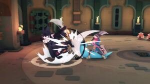 Young Souls nous offre une palette de départ assez classique. Nos deux adolescents peuvent enchainer les coups d’épée, réaliser un nombre limité d’esquives, se concentrer pour réaliser une frappe plus puissante et sauter. À ces coups s’ajoute le non moins classique dash suivi de la glissade. Pour le lancer il suffit de deux appuis dans la même direction, une fois notre avatar en train de courir la glissade ne demande que l’appui sur la touche d’attaque.