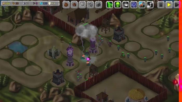 Ce souci de repérage est d’autant plus gênant que le jeu propose un bon nombre de bâtiments que l’on n’a pas l’habitude de voir dans ce type de jeu. Outre les casernes, les tours d’archers, les tours de magie et les bâtiments qui ralentissent les vagues d’ennemis qui se déclinent tous en sept niveaux d’évolution, on trouve des bazars qui vont nous permettre d’échanger des matériaux, avec une commission bien sûr. Mais si le joueur a beaucoup de bois et qu’il manque de pierre, il peut faire du troc à raison d’une ressource récupérée contre deux ressources données. C’est cher, mais c’est toujours utile pour se sortir de situations délicates.