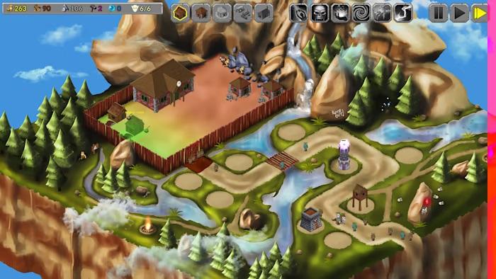 La première idée intéressante est celle qui consiste à devoir récolter son bois et ses pierres en plus de l’argent que l’on gagne à la mort de chaque ennemi. Ainsi les bâtiments ont chacun un coût différent selon trois critères : l’argent, le bois et la pierre. Il va donc falloir bien équilibrer la récolte de ces différentes ressources. Pour cela, en plus des casernes et autres tours d’archers ou de magie, il faudra construire des huttes pour les travailleurs, à savoir les bûcherons et tailleurs de pierre et aussi pour les apprentis sorciers.