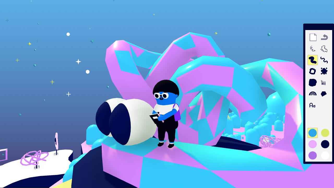 Niveau gameplay, on ne fait pas mieux. Le professeur de ce campus va nous donner divers thèmes à dessiner. Libre à nous d’interpréter ce thème-là et d’en faire un dessin digne de ce nom. Quand le thème est donné, vous allez donc vous retrouver sur la « map », divisée en plusieurs iles flottantes. À partir de là, vous serez en mode dessin pour rendre votre travail au professeur. D’une simple touche, vous pouvez passer en mode exploration, qui vous servira simplement à vous balader soit pour profiter du paysage et des nombreuses œuvres d’art (tout est relatif) qui jaugent le campus, soit pour explorer et trouver des accessoires qui vous serviront pour vos travaux. En effet, au début, vous n’aurez qu’une couleur et un pinceau de disponibles. En explorant par-ci par-là, vous trouverez d’autres façons de dessiner. Un point sympa du jeu s’il n’était pas foutu en l’air par cette fichue caméra aux fraises qui ne cesse de se rapprocher ou de s’éloigner de votre personnage alors qu’on ne lui a rien demandé ! De même, votre personnage est incroyablement lent à se déplacer. La Switch Pro sera à même d’être plus rapide à arriver (joke).