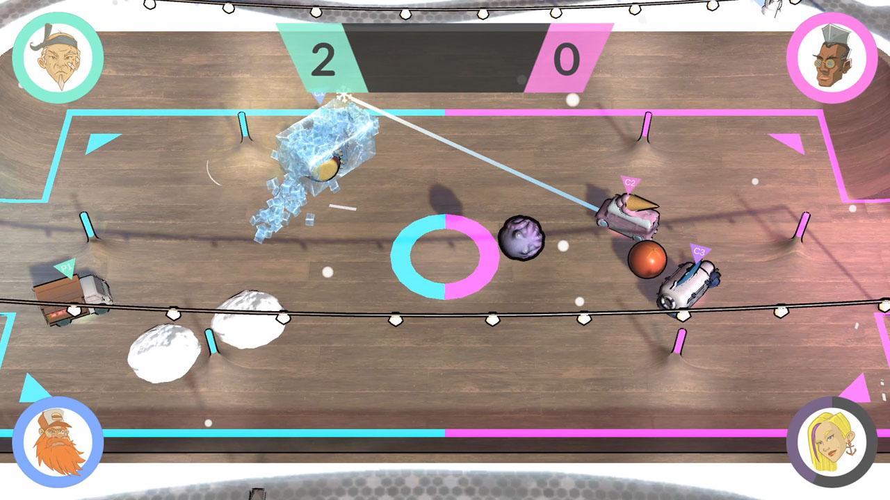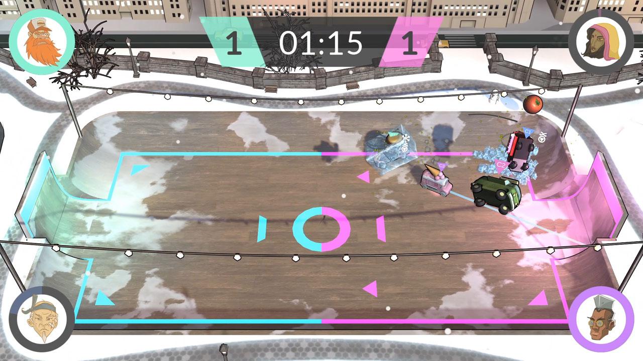 Le principe du jeu est extrêmement simple : vous contrôlez un Food Truck dans un ersatz de stade de football et vous devrez mettre le ballon (ici une tomate) au fond des cages adverses. Vous pourrez faire du 1V1 ou du 2V2 avec 2 règles possibles : avoir un nombre de buts prédéfini ou avoir plus de buts que l’adversaire à la fin d’un temps donné. Le jeu, contrairement à son modèle, est en vue du dessus, nous voyons ainsi tout le terrain tout le temps. Il y a aussi des changements de météo possibles entre chaque match. La possibilité de choisir la courbure du terrain existe également.
