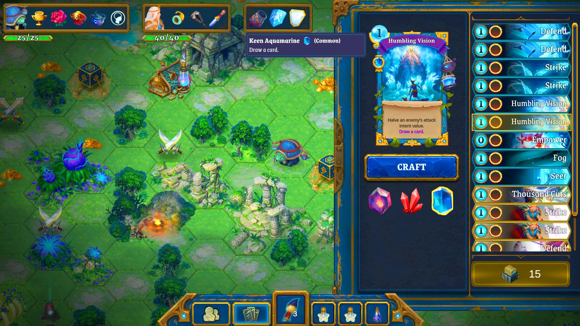 L’autre option qui améliore un peu ce deckbuilding, c’est le système de gemme : vous allez pouvoir modifier certaines cartes en y insérant des gemmes, par exemple une gemme qui fait +3 de défense à l’utilisation de la carte, il y a des gemmes qui vont être très puissantes. Vos cartes auront minimum un emplacement possible et parfois plus. Ce qui est vraiment très intéressant c’est que vous n’êtes pas obligé de les enchâsser avant le combat, vous pouvez le faire à la volée en plein combat, c’est vraiment une possibilité géniale, car parfois +3 de défense dans un tour spécifique peut changer l’intégralité d’un combat.
