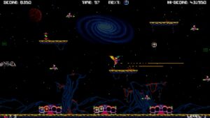 C’est un jeu d’arcade où il faut juste obtenir un maximum de points, chaque niveau est assez unique avec tous les ennemis qui ont un pattern spécifique. Pour vous défendre contre les envahisseurs vous pourrez tirer et utiliser divers bonus tout en esquivant vos ennemis en volant dans les airs. Si vous touchez le rebord des niveaux avec votre personnage ou vos tirs, tout ira de l’autre côté de l’écran ce qui rend possible de tuer des ennemis qui se trouve à l’opposé de vous et plus d’échappatoire. Vous aurez 5 bonus possible à récupérer, obtenir plus de temps, tuer tous les ennemis à l’écran, obtenir une vie en plus, pouvoir tirer devant et derrière en même temps, être invincible pendant une courte période.