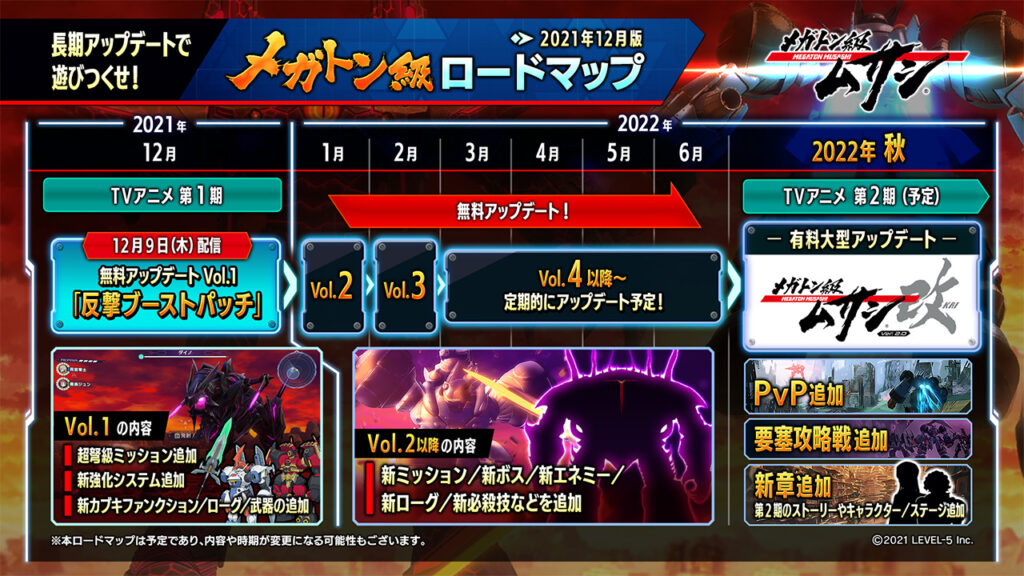 La partie droite concerne l’automne 2022. Level-5 prévoit une seconde saison à l’anime de Megaton Musashi ainsi qu’une très grand mise à jour payante du jeu. Ajouts de scénario, de personnage ou de PvP entre autre.