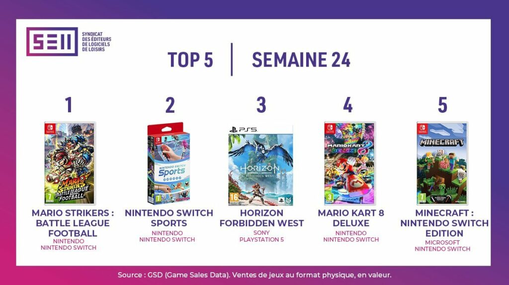 Je vous propose de jeter un œil sur les meilleures ventes physiques en France d’après GSD (Game Sales Data) via le S.E.L.L. pour la semaine 24 de 2022 (celle qui commence le lundi 14 juin 2022 et se termine le dimanche 20 juin 2022).