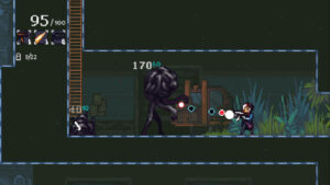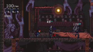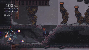 Notre arme de base est lente à entrer en action et nous devons en tenir compte. Il faut terminer une action sans pouvoir l’annuler par une roulade d’esquive et nos munitions sont comptées. Peu importe le moment, le lieu et l’ennemi qui nous fait face, jamais nous n’avons cette sensation de toute-puissance qu’offrent d’autres Métroïdvania. Notre progression dans le titre de Robson Pavia se fait à la dure et ce ne sont pas les quelques points de sauvegarde placés judicieusement et surtout parcimonieusement qui viendront nous dire le contraire.