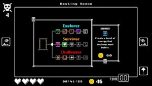 Pour agrémenter nos parties, il est possible, et recommandé de récolter des pièces d’or disposées non innocemment dans le niveau. Cette monnaie nous permettra dès le second étage d’acheter des améliorations à notre personnage. Celle-ci sont de trois types : explorer, survivor ou challenger. En fonction de nos choix, nous pourrons ainsi débloquer des capacités tels un dash, ou des améliorations concernant notre jauge de vie. Tout débloquer nous semble impossible et il faudra alors choisir nos dépenses en fonction de notre façon de jouer.