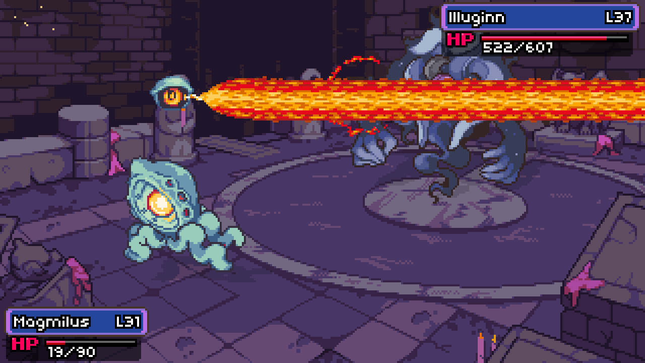 Coromon n’a pas un roster géant, nous avons 120 monstres animés, les Coromons après avoir pris de l’XP vont pouvoir évoluer, comme dans Pokémon cela va se traduire par un très gros bonus de stats et un changement de sa forme. Si on devait reprocher quelque chose à Coromon, ce serait plutôt son chara design global, les Coromon sont loin d’avoir le charme de Pokémon.