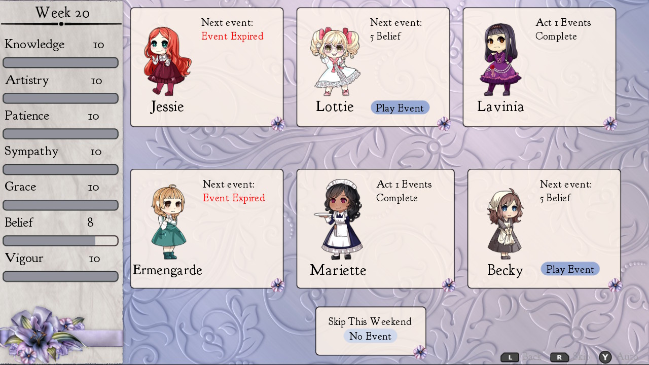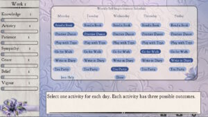 Chaque semaine dans le jeu, vous devrez choisir une activité par jour parmi les activités suivantes : lire un livre, pratiquer la danse, s’amuser avec des jouets, faire une promenade, écrire dans votre journal, faire du tutorat, ou organiser une réunion thé. Selon les activités choisies et les performances de Sara (cette fois-ci déterminées au hasard), vous gagnerez des points de ressource dans différentes catégories semblables à des traits de caractère, à savoir : les connaissances, le talent artistique, la patience, la compassion, l’élégance, la croyance, et la fermeté.