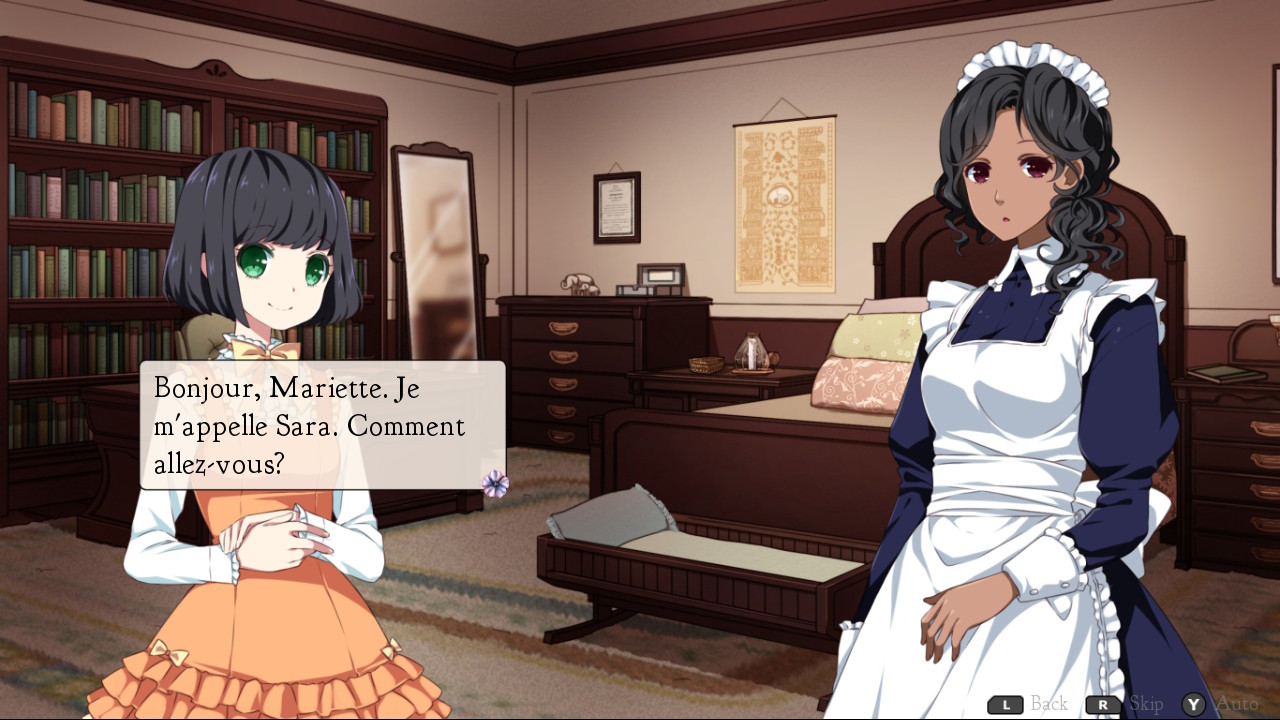 « C’est très bien tout cela, mais, et la traduction alors ? » Aïe. La question fatidique. Chers lecteurs, inutile de vous mentir : comme tout bon Visual Novel qui se respecte, A Little Lily Princess ne propose aucune version française à l’heure où nous rédigeons ce test. Cependant, chers amis anglophobes, soyez rassurés : A Little Lily Princess convient tout à fait aux débutants et utilise un anglais facile à comprendre, et voici pourquoi : comme dit précédemment, nous incarnons Sara, une jeune fille, qui interagit en majorité avec des jeunes filles de son âge. L’histoire reste en soi basique et très simple à suivre. Qui plus est, Sara étant issue d’une famille aisée, celle-ci suit régulièrement des cours de français à travers la première partie du jeu, avec parfois des dialogues donc intégralement en français. Sans compter que l’une des prétendantes de Sara, Mariette, est française également, laissant de nouveau place à des dialogues ou des expressions en français.