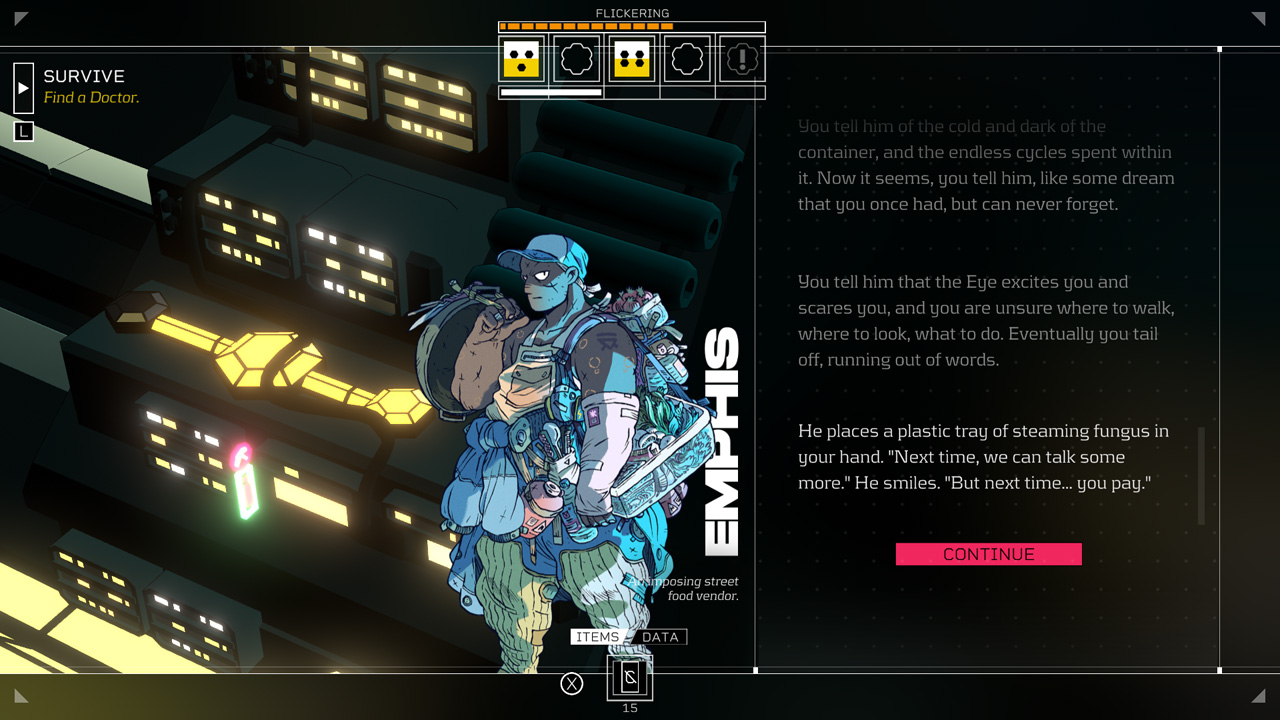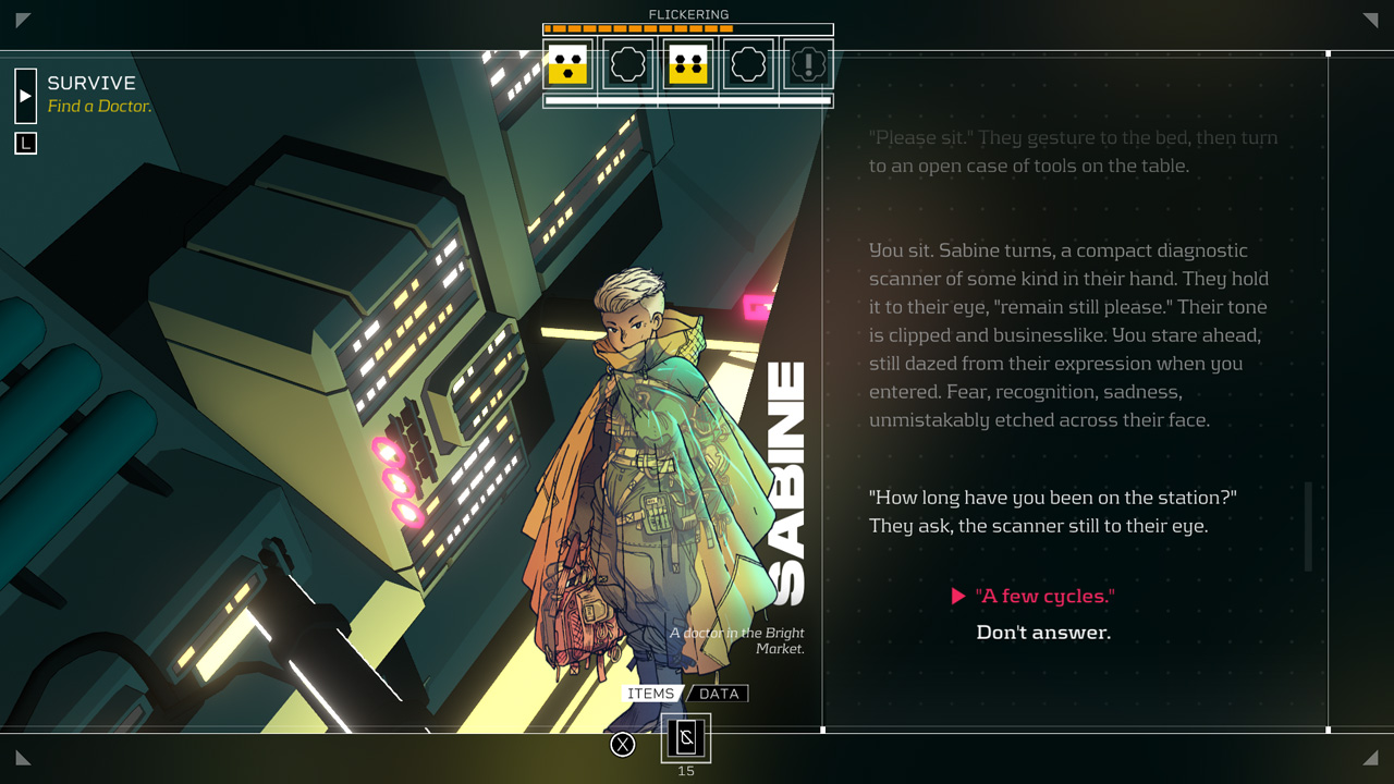 Les cycles ont aussi une influence sur la narration. Nous pouvons débloquer, en fonction de nos réussites ou de nos échecs, des timers. Ceux-ci auront une influence positive ou négative. Ainsi, après lui avoir fourni une première aide bienvenue, Dragos se méfiera de nous et ne pas réussir une nouvelle mission dans un nombre imparti de cycles aura des conséquences, tandis que des navettes de ravitaillement demanderont un certain temps avant de revenir se poser sur Erlin’Eye. Toutes ces phases s’enchaînent agréablement et naturellement. Il est très facile de commencer un cycle de Citizen Sleeper pour passer le temps lors d’un court trajet de métro et de se retrouver à lever la tête vingt-deux arrêts plus loin, et donc quinze arrêts trop loin, tellement nous sommes happés par ces mécaniques et cette narration.