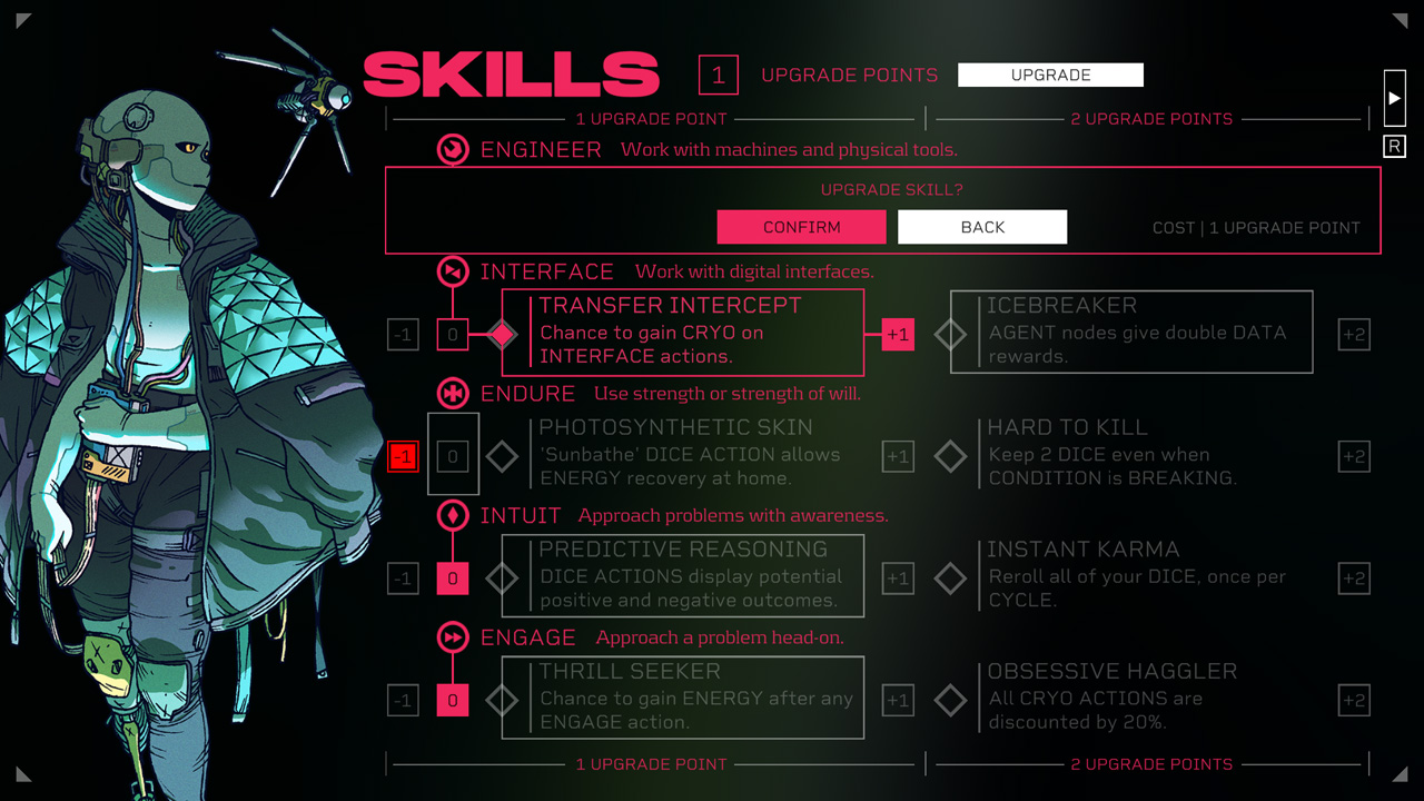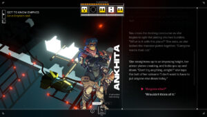 La seconde couche de gameplay est beaucoup plus orientée RPG. Dès le départ nous devons choisir parmi l’un des trois avatars disponibles. Ce choix a des conséquences sur les statistiques de notre personnage. Ainsi le machiniste aura des compétences en ingénierie, mais un malus en engagement, l’opérateur nous simplifiera la tâche pour tout ce qui est interface, mais il aura des lacunes en endurance et pour finir l’extracteur aura un physique à toute épreuve, mais des difficultés pour résoudre des problèmes.