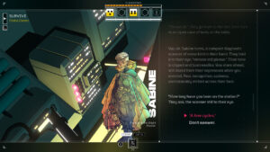 Mais aussi bonne soit-elle, une narration ne fera jamais rien si elle n’est pas soutenue par un gameplay de qualité. Celui de Citizen Sleeper est fait de plusieurs couches. Il y a tout d’abord un côté Visual Novel assez prononcé. Nous passons beaucoup de temps à lire puis à faire des choix. En fonction de ceux-ci, des affinités différentes ainsi que des actions ou des situations différentes s’offriront à nous. Cette partie est assez classique, mais elle fonctionne très bien pour les amateurs de VN dans un esprit SF.