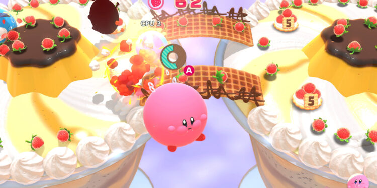 Voici une compétition qui ne vous laissera pas sur votre faim ! Jusqu’à quatre Kirby affamés doivent rivaliser de gourmandise dans des courses et des mini-jeux, sur des circuits croustillants et débordants de crème, de chocolat, de crème glacée et autres délices.