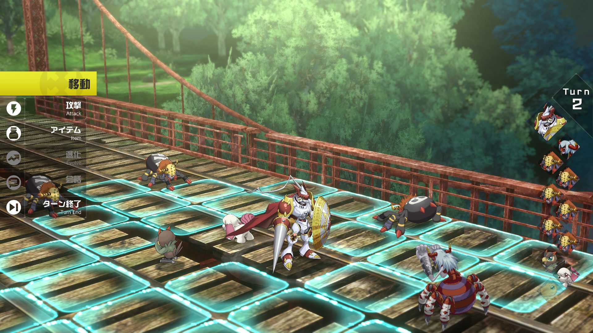 Pour terminer par le sujet qui fâche… Les combats. Comment décrire ces combats en un seul mot ? Ah oui : insipides. Il n’y a vraiment aucune profondeur de gameplay. Vous pouvez bouger, une fois que vous l’avez fait vous pouvez attaquer, au corps à corps gratuitement ou alors une attaque spéciale par Kemonogami qui coûte des SP. De plus, si vous n’attaquez pas alors vous allez vous défendre, mais uniquement de face, pas sur les côtés et encore moins de dos. Autant vous dire que le jeu ne vous laisse aucune possibilité de jouer tactiquement, il faut juste foncer et attaquer. Nous pourrions aussi rajouter que la transformation de nos Kemonogami au cours d’un combat sont réservés au « starter » de votre groupe, Agumon, qui pourra donc évoluer en Tyrannomon, Tricéramon ou encore WarGreymon. Plus le stade est élevé, plus le coût est élevé (il commence à 5 et augmente de 5 par niveau). De plus, ce coût est à payer chaque tour, mais autant vous dire qu’il est ridiculement bas. Surtout que si vous avez des alliés pas loin, il y a de grandes chances qu’ils vous redonnent des SP en fin de tour…