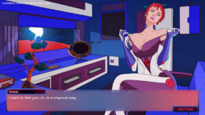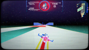 D’un point de vue ambiance musicale, c’est donc un bon point, d’un point de vue visuel, les illustrations des différents personnages durant les phases de Visual Novel sont assez jolies (même si on a déjà vu plus travaillé). On aurait apprécié plus d’interactions avec plus de personnages et la possibilité d’explorer d’autres lieux… On note également que pour encore appuyer ce côté « rétro », le jeu affiche un filtre effet « CRT image qui tremble », mais uniquement sur le menu principal et durant les phases en vaisseau… Les phases de Visual Novel restent d’un aspect « classique ». Le filtre ne peut pas se désactiver, mais il n’est pas dérangeant pour autant. De manière générale, l’ensemble du titre fait penser à un jeu des années 80, mais nous donne l’impression par moment de ne pas être fini… On vous explique ! L’absence de la disposition des touches dans un menu option, mais uniquement en tant qu’image de fond pendant les chargements donne un peu l’impression d’avoir été oublié, mais finalement, on le met là pour que ça se voit… Quand on fini une course en mode Arcade, notre score (durée pour finir le parcours) n’est pas sauvegardé… D’ailleurs, on sait qu’on atteint la fin de la course quand on voit apparaître un tunnel (ce qui est d’ailleurs similaire à ce que proposait la source d’inspiration des développeurs, SkyRoads). Mais une fois le tunnel atteint, hop écran de chargement et retour à l’écran de sélection de la course sans un petit mot ! On regrette alors que l’équipe de Dev9K se soit contenté de reprendre le concept de SkyRoads sans pour autant essayer d’y apporter d’autres améliorations (autres que graphiques et sonores)…