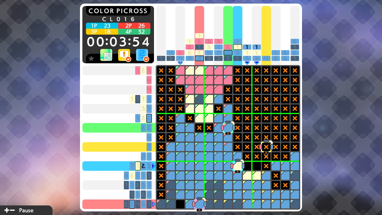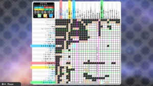 Le mode Color Picross est apparu dans le précédent Picross et est très rafraîchissant, vous débloquerez ici des gifs et non plus des images (bon ok, la récompense est toujours aussi inutile.), cependant nous ne travaillons plus seulement sur des cases à noircir, mais à colorier ! Ici plus besoin de laisser une case vide (sauf si c’est la même couleur d’affilée), les indices sont donnés par couleur et parfois, il faut jongler avec jusqu’à 5 couleurs sur la même grille, ces grilles vont aussi de 5×5 à 20×15 ! Le challenge est encore plus ardu, mais très agréable et nous déboussole un peu dans nos habitudes de comptage.
