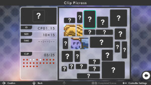 Le dernier mode est le mode Clip Picross, ce dernier est au final une image géante composée de plein de petits Picross, allant du très petit au très grand, c’est très agréable de voir l’image se dévoiler au fur et à mesure, il faudra jouer au mode Picross pour débloquer les mini-clips à réaliser.