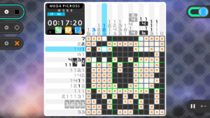 Le mode Mega Picross est plus difficile que le mode classique, vous aurez là encore 150 nouveaux Picross à résoudre, mais cette fois-ci les règles sont plus complexes, vous n’aurez pas un indice pour une colonne/ligne, mais parfois pour deux d’un coup, par exemple si l’indice 7 apparaît sur deux lignes, il faut alors que 7 cases soient grisées à la suite sans casser la chaîne, mais cette fois-ci sur deux lignes, c’est souvent bien plus difficile à déduire !
