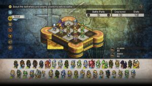 L’autre grosse nouveauté c’est le nouvel écran d’avant bataille. Vous allez depuis ce dernier pouvoir choisir vos unités, mais surtout pouvoir jeter un coup d’œil à la carte du niveau afin de pouvoir du coup adapter votre équipe au terrain ou à l’adversaire. Depuis cet écran, vous allez aussi pouvoir modifier les équipements, sorts et techniques de vos personnages sans avoir à retourner à la carte. Merci.