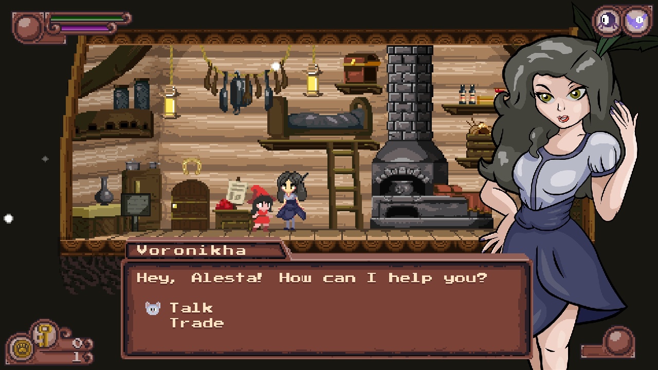Alesta est une jeune sorcière qui commence à peine son apprentissage aux côtés de sa mère, dans une petite maisonnette très mignonne et bien tenue. Tout se passe bien jusqu’à la mort inopinée de sa mère, dont cette dernière était visiblement au courant et qu’elle avait réussi à repousser. Alesta, en tant que bonne sorcière, se lance donc dans une quête pour ramener sa mère à la vie, et donc chercher un personnage qui saurait rebrousser le chemin de l’au-delà : un chat. Alesta n’est pas tant attachante en elle-même, mais nous souhaitons dès le début l’aider, ou en tout cas partir à la découverte de ce monde.