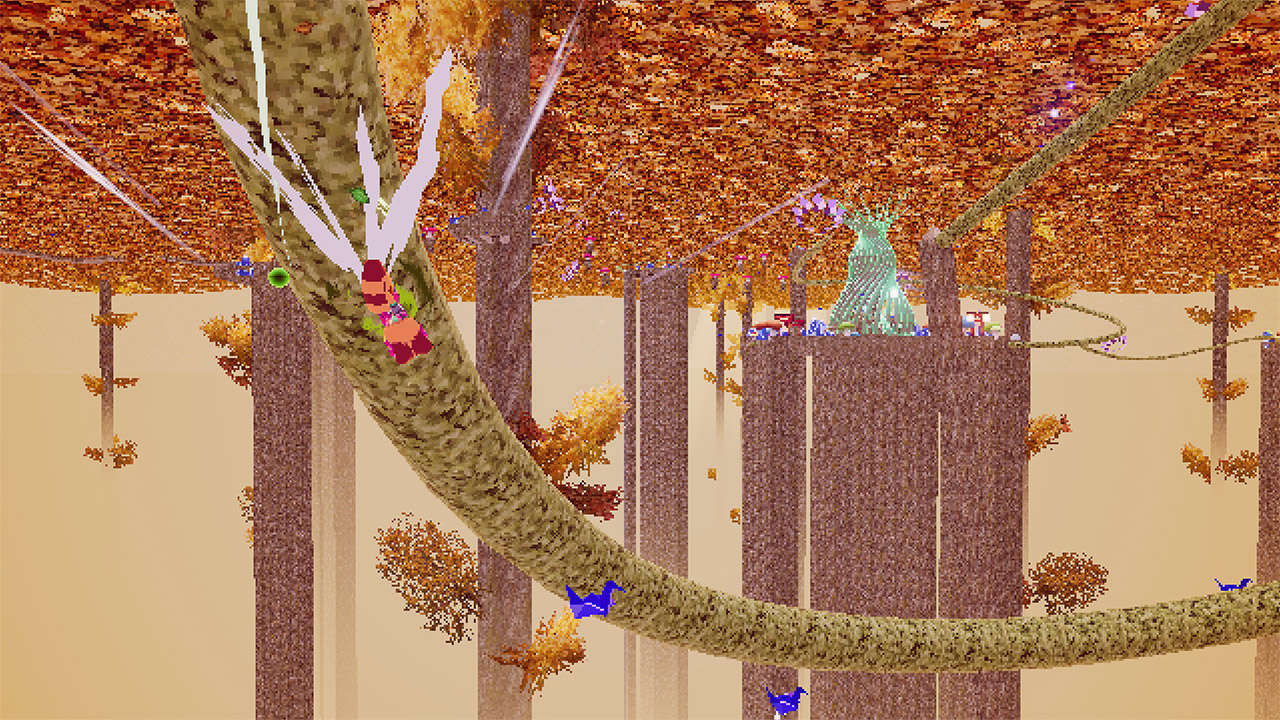 Vous aurez le contrôle d’Hana une jeune tanuki qui a les capacités classiques d’un plateformer : un double saut ainsi qu’une attaque spirale qui sert à la fois d’attaque et de 3ème saut (un peu à la Mario Galaxy). Vous pouvez évidemment courir, mais sa course est particulière : si vous essayez d’aller au-delà de la diagonale, elle perdra fortement en vitesse. La perte de vitesse est provoquée par un demi-tour ou en tournant le stick à droite ou à gauche, ce qui est intéressant, vu que le jeu demande souvent d’enchainer les sauts et les attaques spirale et vous serez donc récompensé par une accélération si vos sauts sont bien exécutés. Lors de votre ascension dans le niveau, vous affronterez 4 types d’adversaires : des Kasa-obake (un yokai parapluie), des cubes vivants qui sortent des pics de leur corps, des cubes volants, et des balles qui roulent. C’est bien dommage que le bestiaire soit si réduit surtout qu’ils seront rarement une menace, ils sont là principalement pour vous faire perdre du temps. Vous aurez 7 mondes divisés en 2 niveaux chacun, sauf le dernier où vous aurez 3 niveaux qui ont tous un thème particulier (monde bonbon, monde de l’automne, monde du japon, etc…).