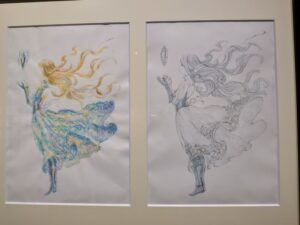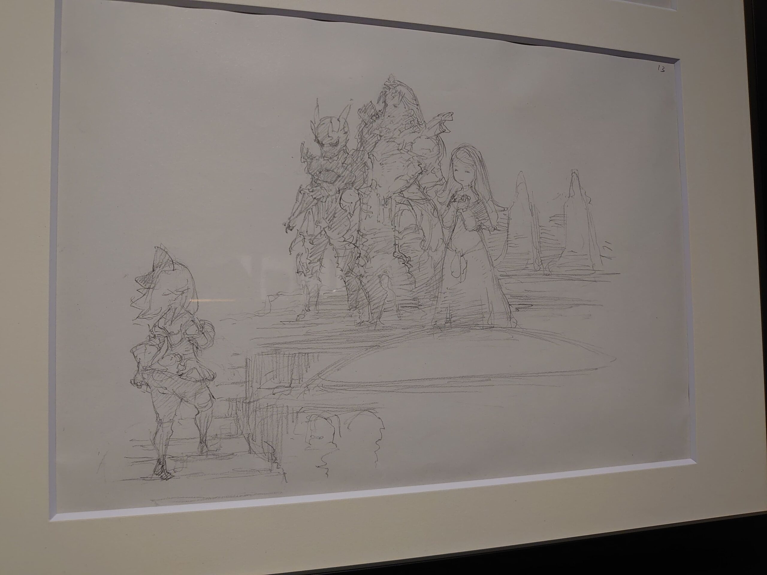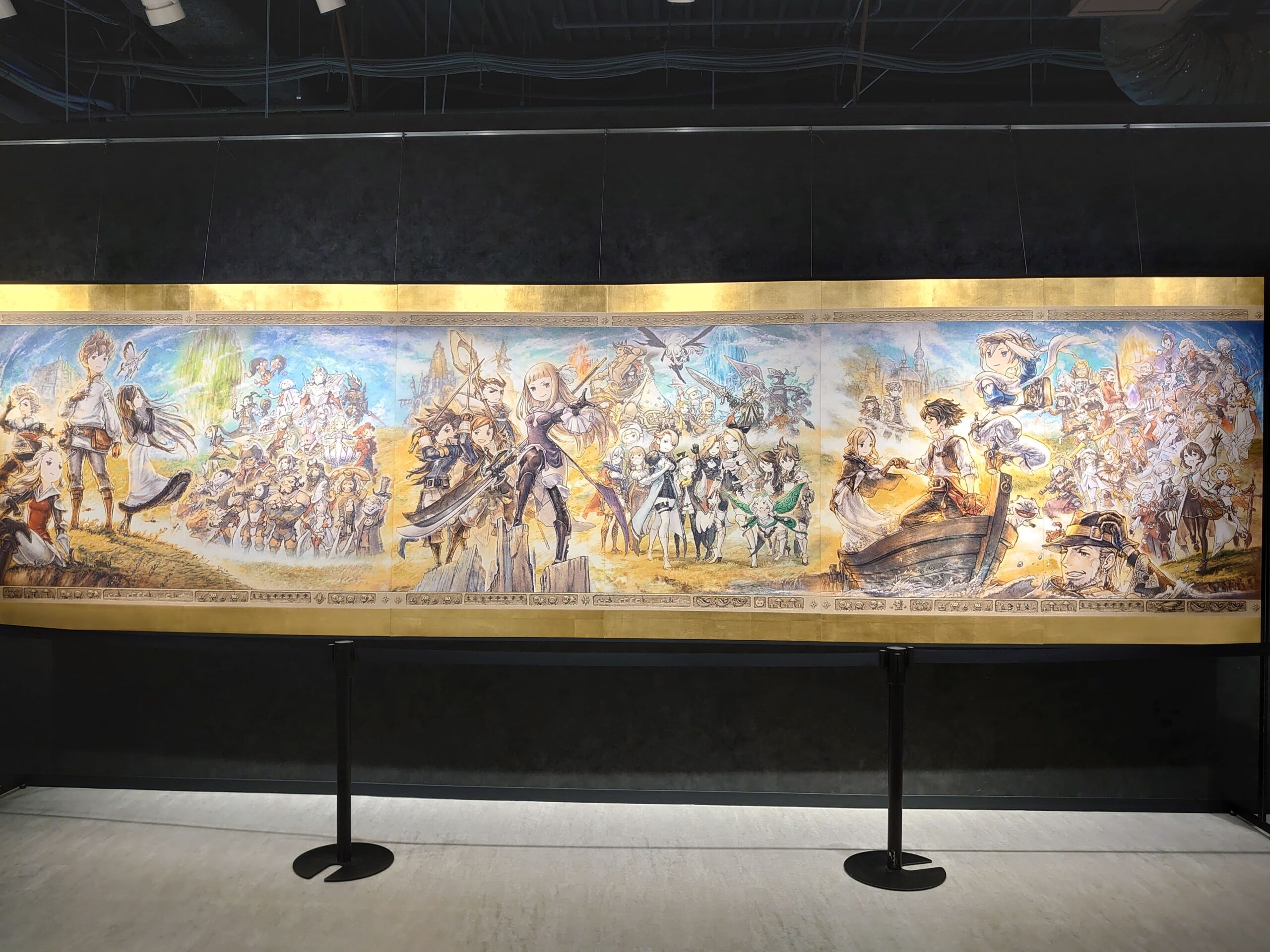 En continuant sur le couloir, nous avions de nombreuses esquisses, ébauches et artwork connus ou non des fans. Il y en avait bien plus que nous n’aurions imaginer. Il y avait également des zones de l’exposition dédié au premier Bravely Default affichant les début du projet, les premières lignes du scénario et tout ce qui a finalement amené à ce qu’est devenu Bravely Default: Flying Fairy sur Nintendo 3DS. Nous n’avions pas la possibilité de vous montrer cela mais le texte étant en japonais, il va sans dire que peu d’entre vous aurait compris grand chose.