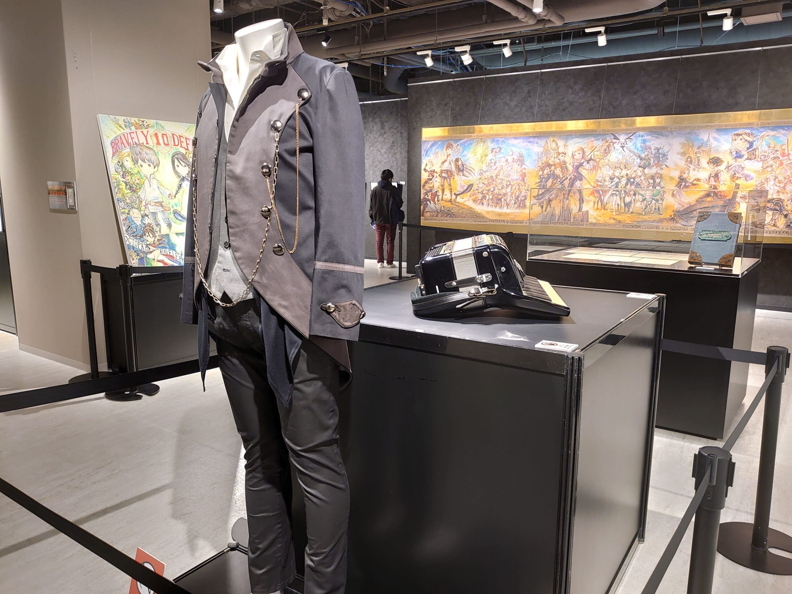 A un certains tournant de l’expo, nous avions le costume de scène et l’accordéon de Revo, le fameux compositeur de la série. Pas évident à visualiser en occident mais le groupe formé par Revo, Linked Horizon, ont fait de nombreuses performances lives au Japon. Durant une de ses performances Revo portait ce costume et jouait de cet accordéon. Il y avait aussi un message sur plusieurs page du compositeur derrière à l’occasion de ce 10ème anniversaire. Celui-ci ne prenait d’ailleurs pas tout le crédit sur la composition en n’oubliant pas de mentionnait le compositeur Ryo du groupe Supercell qui s’était chargé de l’OST de Bravely Second. A côté et derrnière, une énorme fresque et une belle affiche pour les 10 ans de la série.