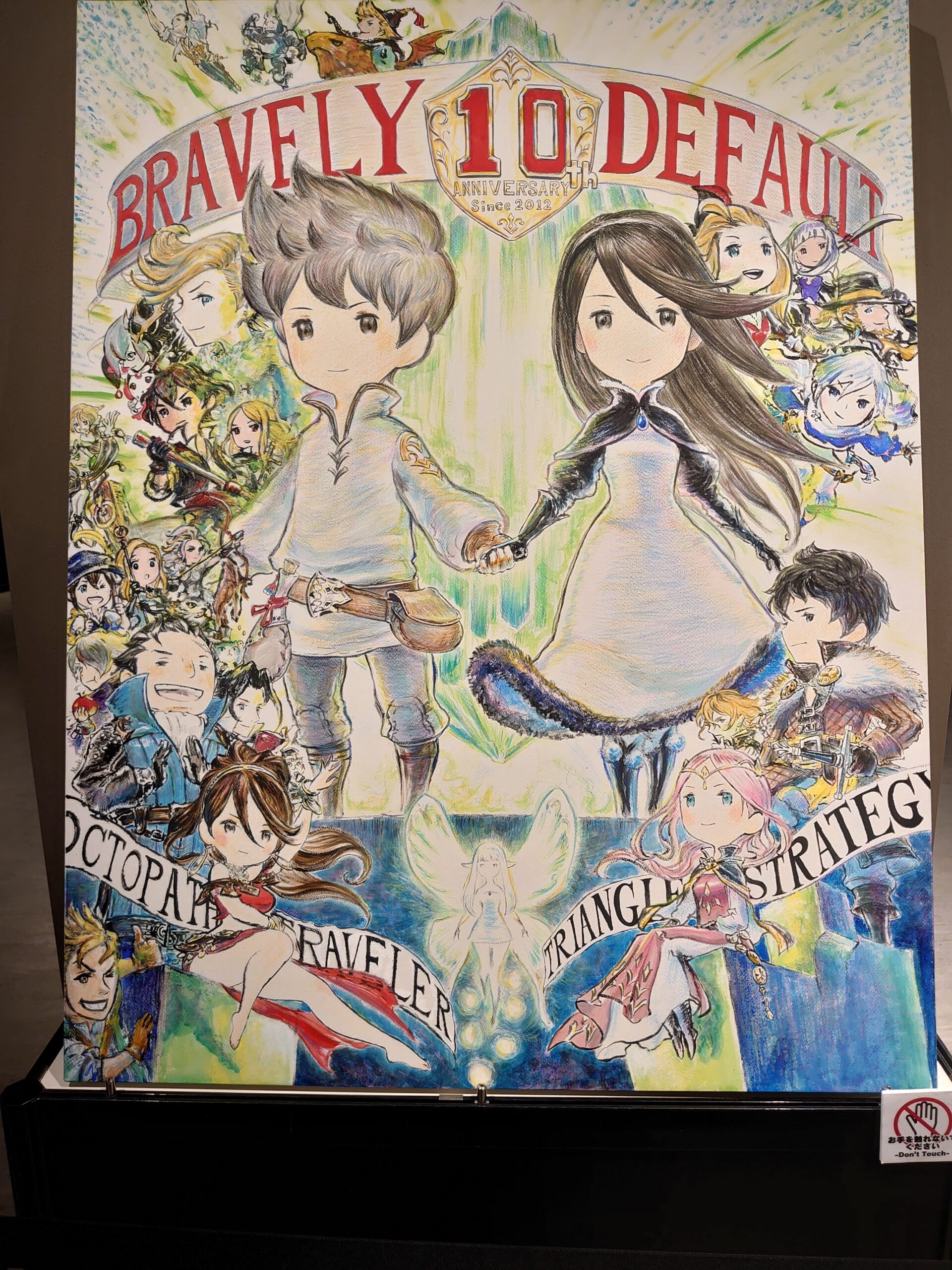L’exposition s’étendait encore avec de nombreuses autres esquisses et ébauches. Un couloir nous permettait également de tamponner les logo de la série à chaque année anniversaire. Puis surtout, d’autres travaux de la Team Asano étaient également présent. Ainsi au-delà de la série Bravely, quelques esquisses, ébauches et artwork de Octopath Traveler, Triangle Strategy, Various Daylife et également Octopath Traveler II (à sortir le 24 Fevrier 2023) étaient également affiché sur le dernier couloir de l’exposition avec même un trailer du dernier cité. Malheureusement, nous n’étions pas dans la possibilité de vous prendre ce couloir en photo avec peut être certains dessins et personnages pas encore présenté à ce jour. Au bout, se tenait ainsi la boutique de l’expo afin de terminé sur quelques achats pour célébrer les 10 ans de la série et même participer à une loterie à goodies à faire tourner une fois tous les 3000 yens dépensés.