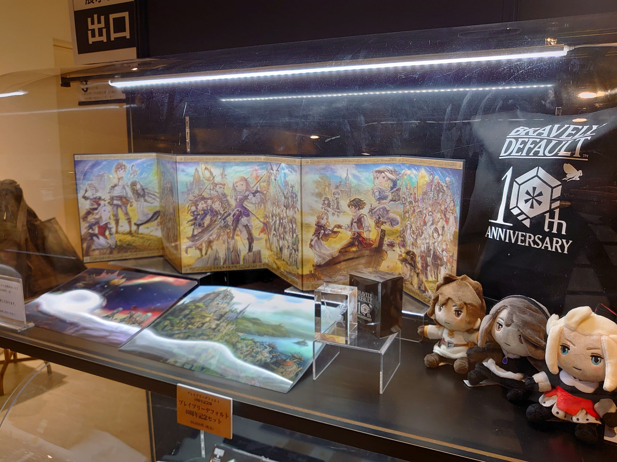 Le centre commercial du Yurakucho Marui est grand mais on ne rate pas l’exhibition situé au 8ème étage avec cette belle affiche. D’ailleurs à côté, un immense écran diffuse l’intro de Bravely Default avec un volume sonore assez conséquent.