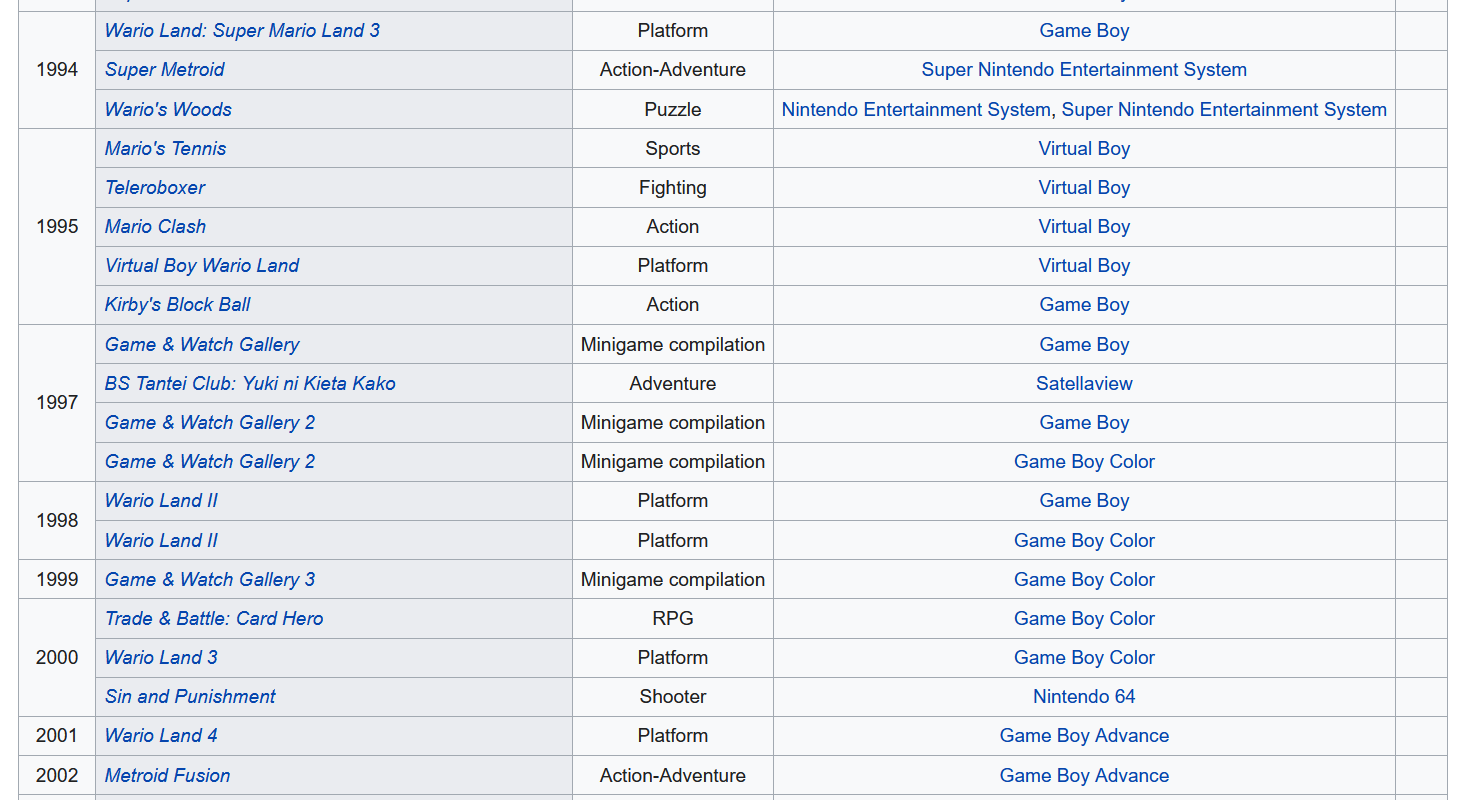 Repartons dans les années 90, lorsque les grands classiques de Nintendo ont fait leur transition en 3D sur la Nintendo 64, sauf Metroid. Miyamoto avait encore de l’enthousiasme pour les jeux en 2D au début de l’ère 3D, tout autant qu’il en avait pour ce que la N64 pouvait faire comparé à ce qui était faisable sur Super Nintendo. C’est ce qu’il racontait au travers de nombreux magazines de l’époque. Avec le succès de Yoshi’s Story qui alliait les 2 mondes avec sa 2.5D, il imaginait un Metroid 64 en 2.5D qui aurait été la suite de Super Metroid, un peu comme comme Castlevania Symphony Of The Night sorti 6 mois après la N64 et qui fit rentrer dans le langage commun le terme « Metroidvania ». Mais Metroid n’étant pas sous son contrôle, il ne pouvait que suggérer l’idée. La série était sous le contrôle de Nintendo R&D1, qui était occupé à créer des jeux sur Virtual Boy et sur Game Boy comme on peut le voir sur la liste des jeux développé par cette branche de Nintendo.