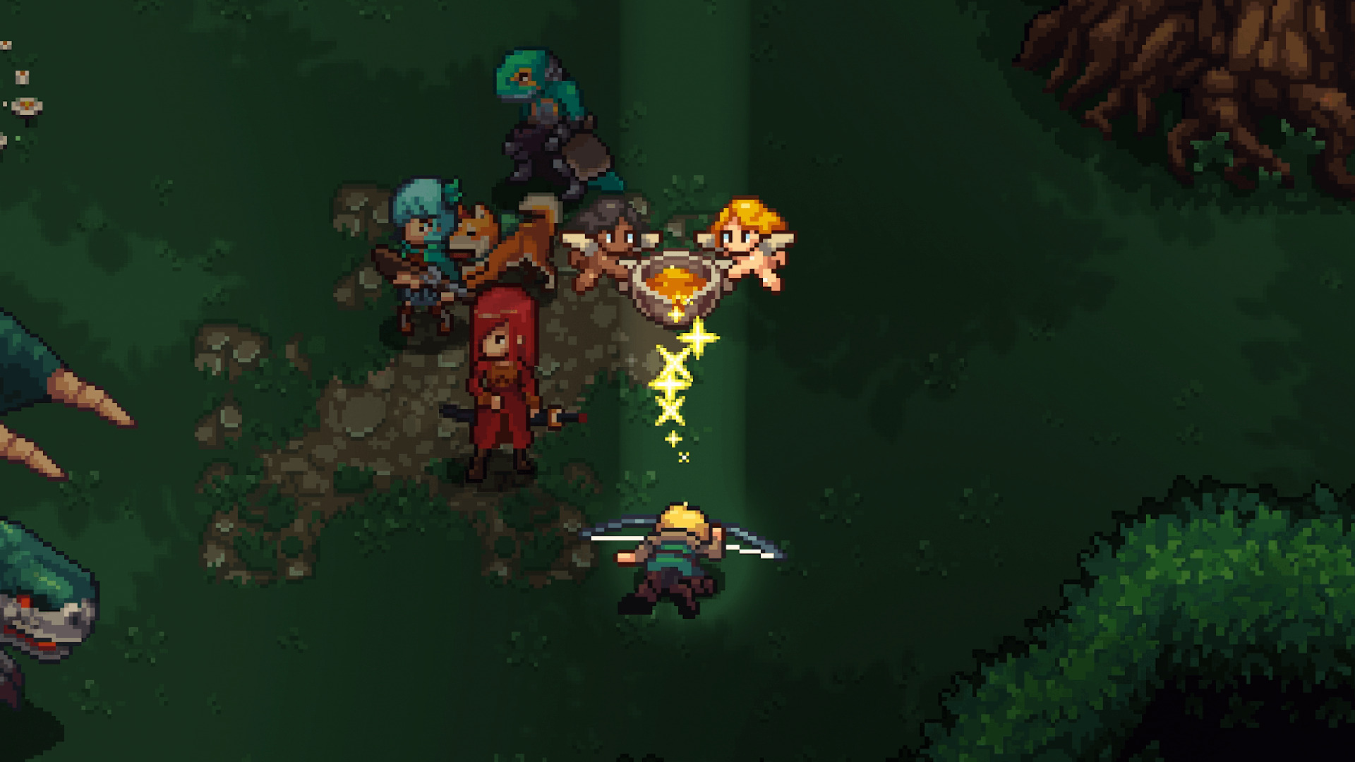 D’un point de vue graphique, si nous sommes loin du rendu chatoyant du moteur HD-2D de Square Enix, nous déambulons dans un monde en pixel art d’une très grande qualité qui regorgent de détails et de vie. Une balade en forêt signifie observer la fuite de petits animaux tandis qu’un passage dans une grotte amène à des jeux de lumière sur les cristaux. Cette qualité ne se fait jamais contre la lisibilité qui reste exemplaire dans l’ensemble des biomes que nous avons visités.
