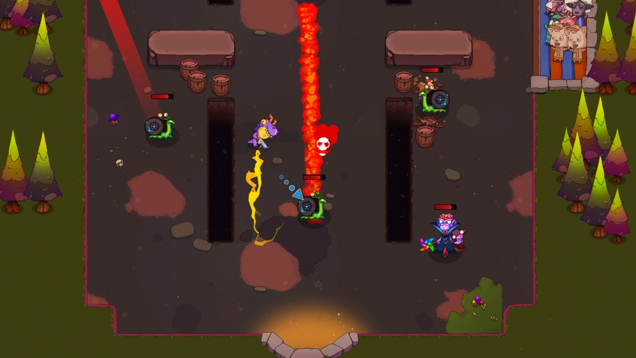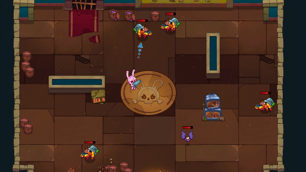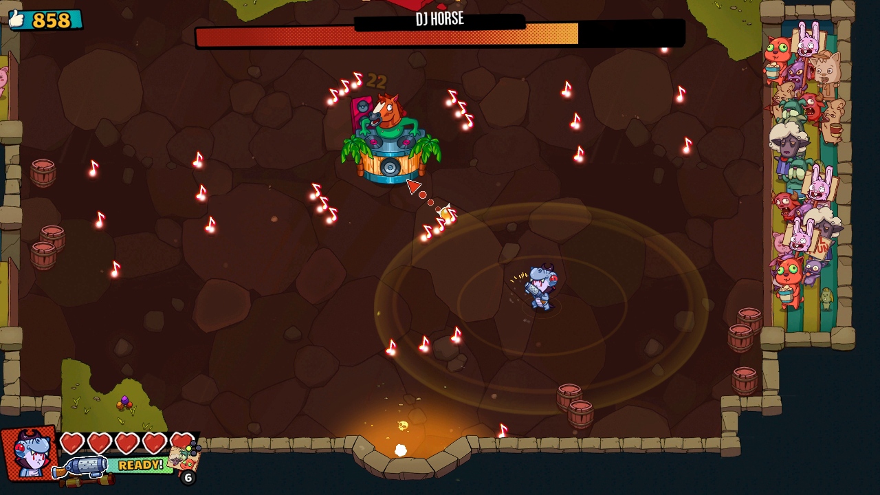 Mais ce n’est pas le seul problème de gameplay auquel nous allons devoir faire face. Chaque appui sur le bouton A déclenche un tir de notre part, très bien, mais il arrête aussi notre personnage. Il est impossible de tirer tout en avançant. Mais sans être face à un Bullet Hell, les projectiles qui nous assaillent peuvent vite être nombreux et il nous est impossible de tirer tout en les évitant et spammer le bouton de tir pour avoir un semblant de déplacement. Là encore, l’impression générale est vraiment désagréable comparée à la fluidité d’un Enter the Gungeon ou d’un It Came from Space and Eat Our Brains, pour ne citer qu’eux.