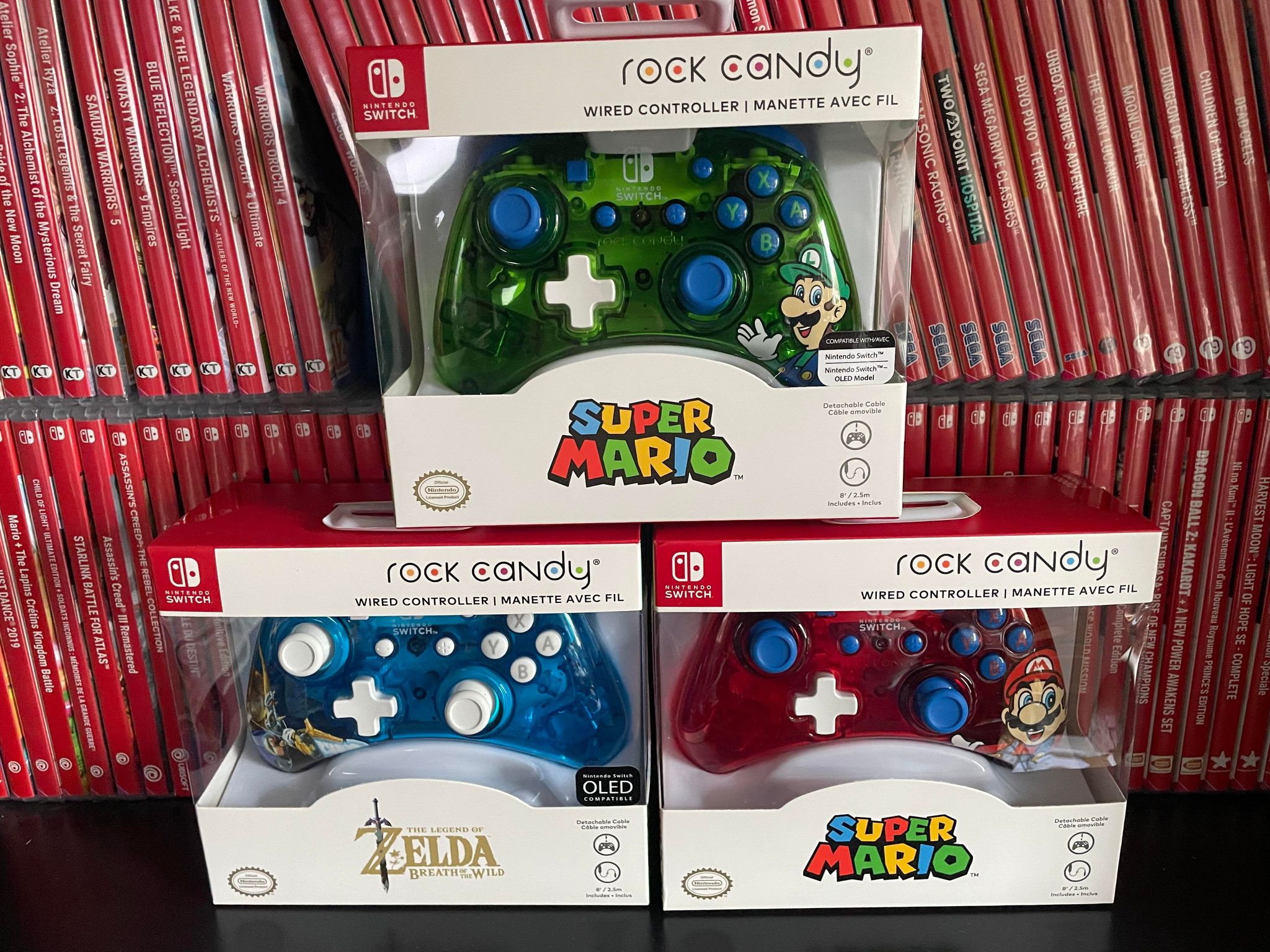 Autre type de manettes, les PDP Rock Candy. Elles proposent une nouvelle taille ergonomique pour des mains plus confortables, surtout pour les petites mains avec des touches élégantes et concaves pour le pouce permettant une précision optimale. Les coques en polycarbonate transparent aux couleurs vives vous permettent de voir le circuit interne du contrôleur, mais propose aussi un petit design sympathique à effigie de Mario Luigi et Link. La manette propose un câble micro USB de 2,5 mètres qui est amovible pour un transport plus « safe » mais aussi si vous voulez prendre un câble plus grand.