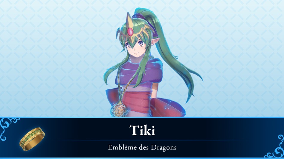 Le bracelet d’emblème des dragons : Tiki est un emblème relativement puissant. Elle permet à votre unité de se transformer en un puissant dragon lors d’une fusion. Le dragon bénéficie d’un boost de stats important durant la fusion et il lance alors de puissante attaque physique ou différents souffles de dragon aux effets différents. Avec la “Griffe Eternelle”, Tiki privilégie le taux de critique pour une possible attaque puissante. Son “Coup Caudal” vous limite à une seule attaque puissante mais repousse l’ennemi. Par ailleurs, ce coup se lance en premier. Elle possède ensuite 5 souffles: Igné, Glacial, Enflammé, Sombre et Embrumé.