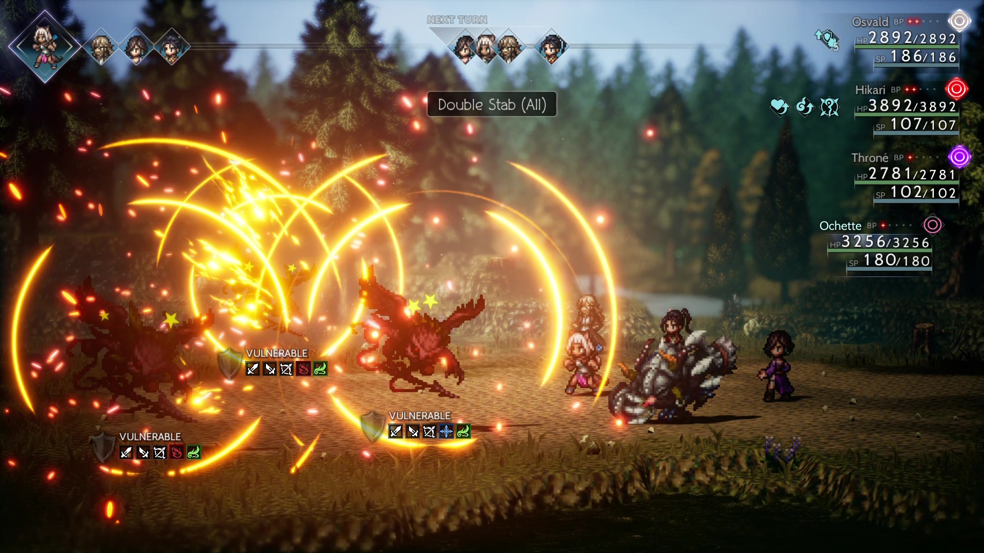 Les aptitudes sont divisées entre nos compétences de classe et ce qui s’apparente à des spécialités propres à chacun de nos personnages. L’originalité d’Octopath Traveler provient de sa mécanique de “Break and Boost” qui vous demandera justement d’user des subtilités du système que nous avons cité. Le “Break and Boost”, c’est la possibilité de pouvoir totalement briser la garde ennemi et de grandement booster vos compétences ou attaques. Dans les détails, les ennemis ont un certain nombre de points de défense, en utilisant les faiblesses de ces ennemis nous pouvons faire descendre leurs points de défense. Ces faiblesses ne sont pas juste élémentaires mais potentiellement liées à une arme précise, d’où la pertinence de choisir l’arme de votre attaque.