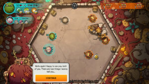 Les parties se déploient au cœur d’arènes particulièrement atypiques et intéressantes… En effet, ces dernières regorgent de bonus, de potions, de coffres… mais aussi de pièges, de piquants… afin de pimenter la partie. Il ne suffit donc pas de donner de valeureux coups de tête à l’adversaire, mais bel et bien de faire preuve de stratégie afin d’arriver à ses fins ! L’écran de jeu récapitule notamment les points de vie de votre petit monstre (et de ses alliés) mais aussi des ennemis. De quoi rester focus sur sa cible !