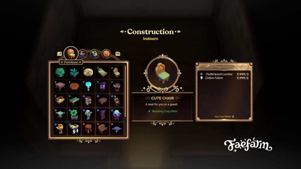 Au fil du temps, vous aurez également la possibilité d’agrandir votre maison avec plus de pièces et plus d’espace pour exprimer votre style unique. Vous aurez également la possibilité de collectionner jusqu’à quatre maisons dans tout Azoria. Avec tout cet espace, vous pourrez profiter du système de confort de Fae Farm. Certains meubles peuvent conférer des bonus spéciaux à votre personnage, en augmentant son maximum de santé, d’énergie et de mana, ainsi que la vitesse à laquelle vous rechargez ces caractéristiques lorsque vous êtes à l’intérieur de votre maison.